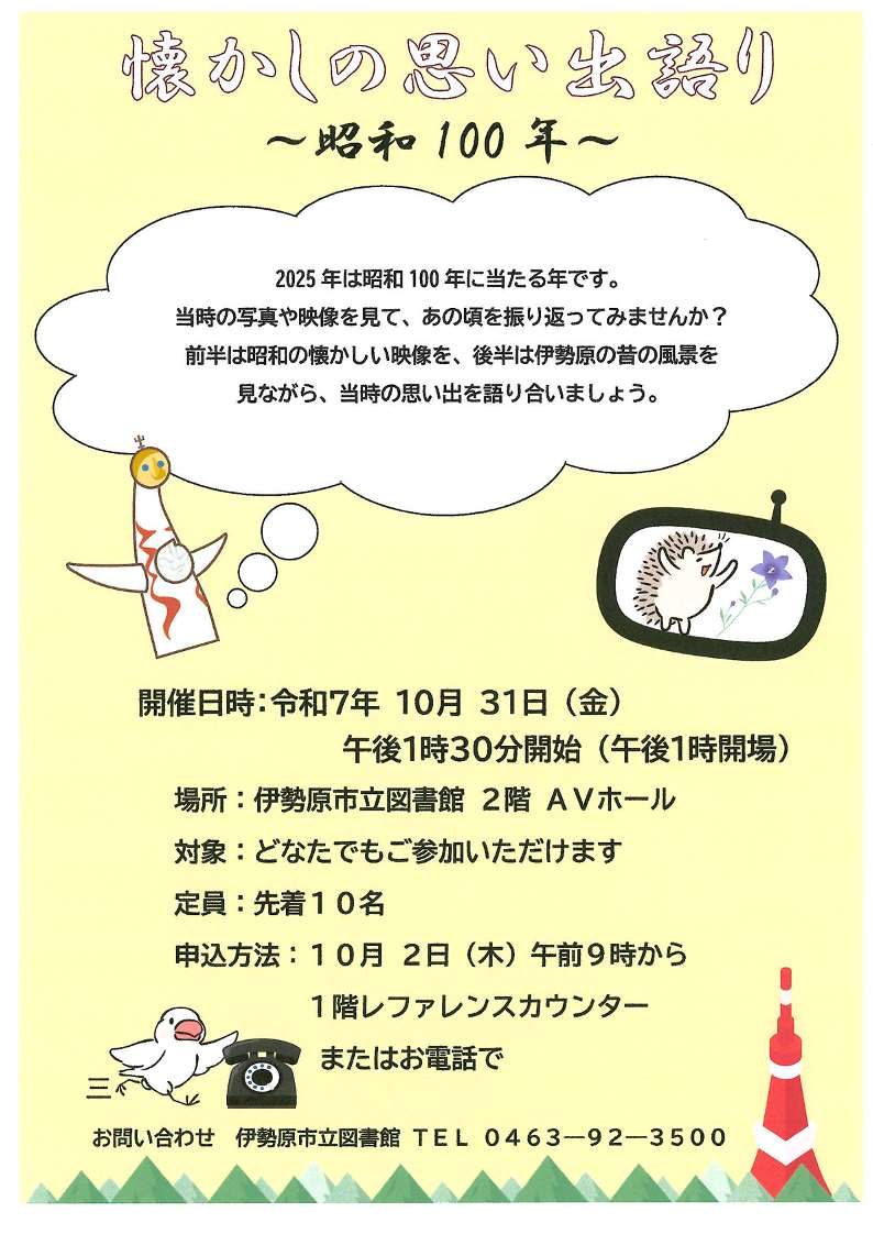 詳細内容 | 2025年は昭和100年にあたる年です。 平成も終わり遠くなった昭和ですが、今はレトロブームで再注目されています。 当時の写真や映像を見て、あの頃を振り返ってみませんか? 前半は昭和の懐かしい映像を、後半は伊勢原の昔の風景を見ながら当時の思い出を語り合いましょう。 定員に達したため受付は終了いたしました |